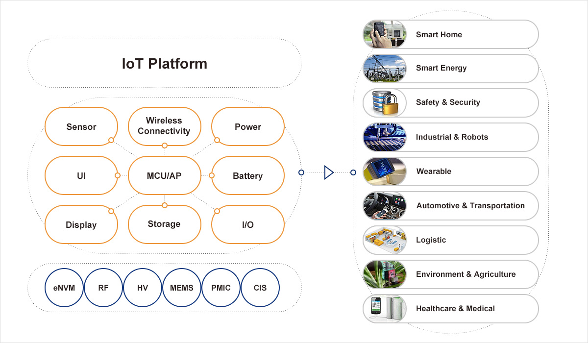 物聯網產品通常具有功能多樣性以及快速的上市回應等特點,產品結構以傳感、微處理、存儲、互聯為主,注重微小體積和超低功耗。中芯國際提供低功耗邏輯及射頻工藝,結合嵌入式閃存,設計公司可在智能家居、可穿戴式設備、智慧城市等各類物聯網產品上優化安全性能和成本結構。