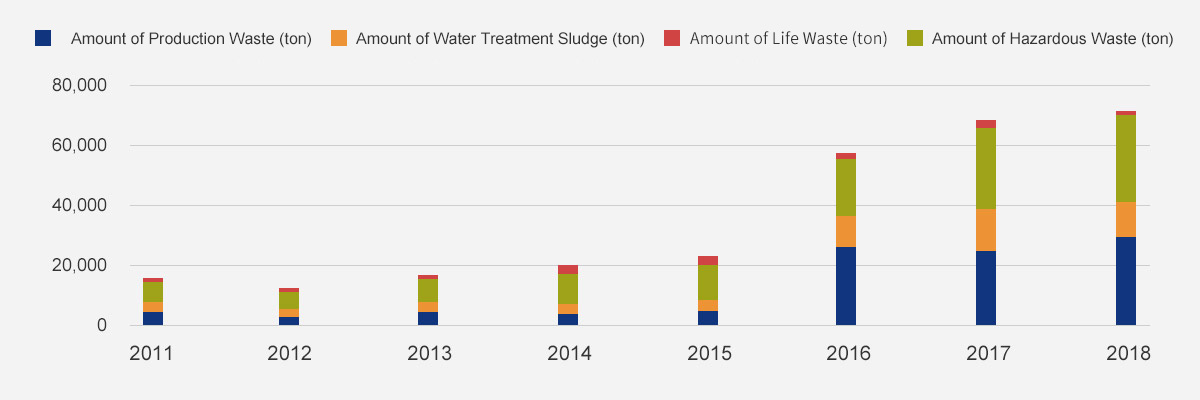 SMIC establishes a sound waste management system and strictly complies with the national regulations in treatment of the produced waste. The waste produced in the workshop is subdivided into acidic, alkaline, toxic, oxidizing, natural, flammable and general substances, which are distinguished with the recycling buckets in different colors. The classified waste substances are collected on a regular basis and transported to the hazardous waste warehouse for temporary storage, before being delivered to the firms with hazardous waste treatment qualification.