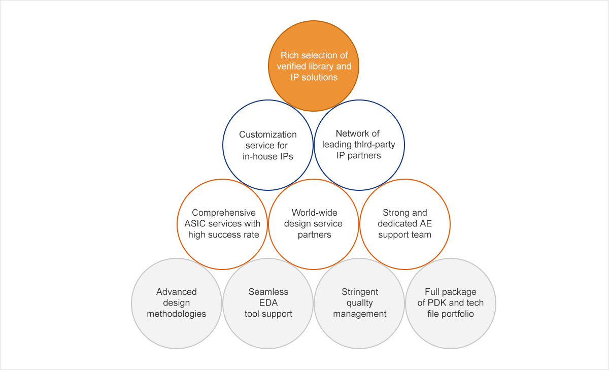 中芯國際成立於2000,已成為世界領先的半導體代工企業之一。中芯國際設計服務中心提供了從200mm到300mm晶圓所涵蓋的各個技術節點,由內部研發團隊及認證的IP供應商設計的符合最高的質量標準的IP和Library,幫助客戶基於SMIC工藝進行芯片設計。