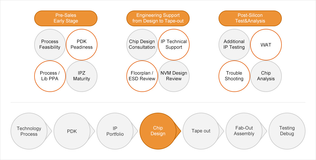AE(工程應用)團隊可以在每個設計階段提供IP技術支持、定製、設計諮詢、模擬調試和建議,NVM IP諮詢、規劃/防靜電保護和IP融合服務。