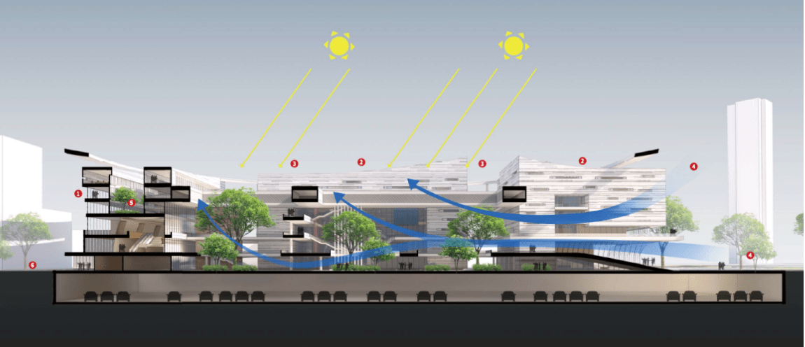 灰白色石材外墙与微曲的屋面彰显优雅的文化气质,层次丰富的庭院空间改善了建筑通风与采光效果。连廊交错,内外交融,传统的岭南建筑园林文化在方案中得到传承,并通过现代的建筑语言手法得以展现。