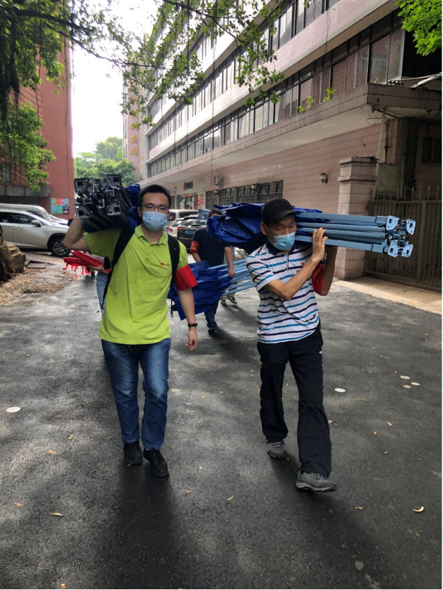 “星耀总承包”党员志愿服务队抵达核酸检测支援现场后,迅速投入工作中,各司其职,协助街道搭建核酸采样点工作棚、搭建检测点工作台、搬运核酸检测工具、悬挂核酸检测点横幅等,全力做好核酸检测前期准备工作。