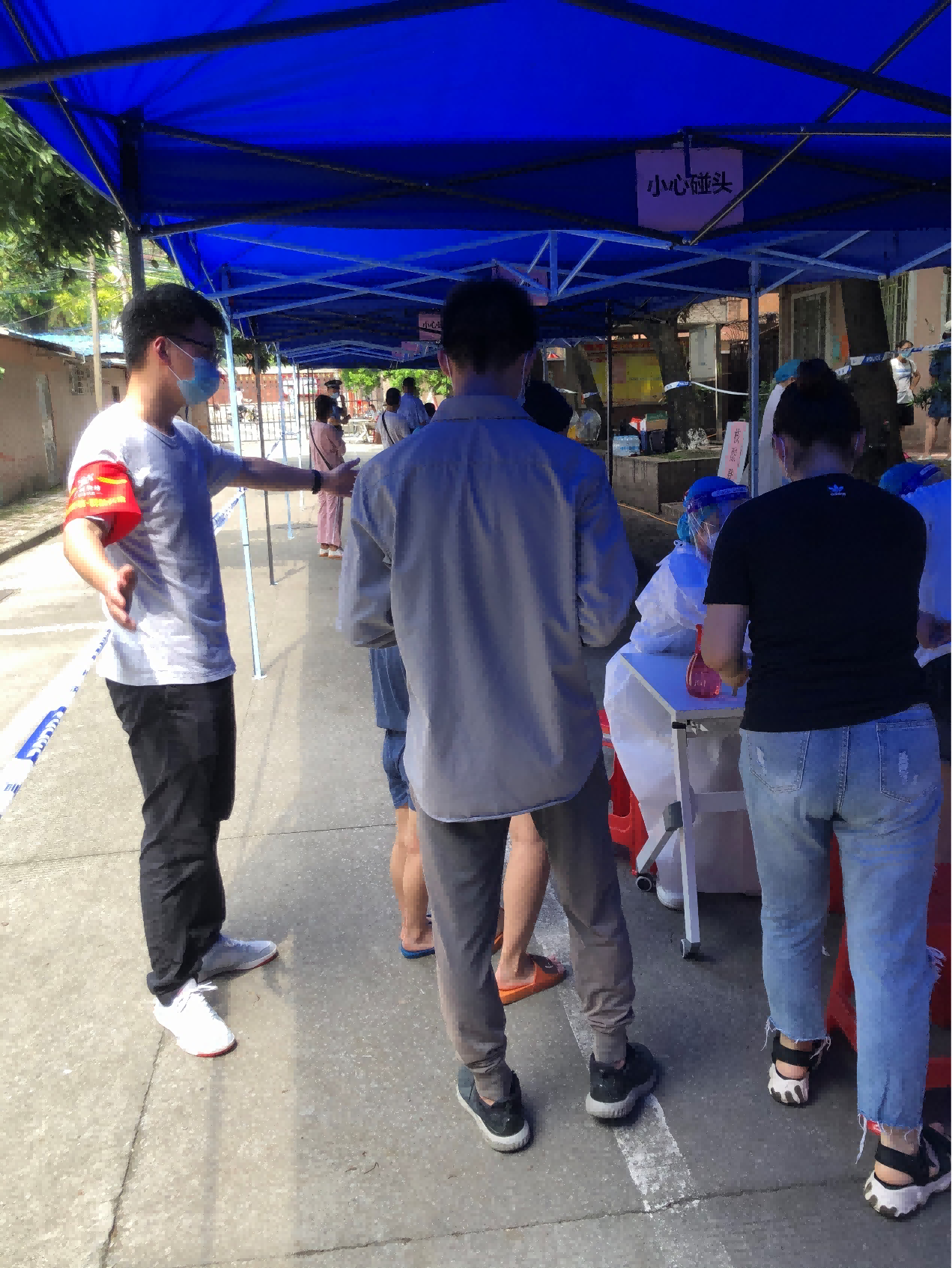 5月30日下午,室外温度接近35摄氏度,志愿服务队队员耐心引导现场排队秩序,协助解答疑问;为了保障防控物资供给,志愿服务队员们搬运防疫消暑物资,来来回回走了无数次……没一会儿,汗水便湿透全身,但党员志愿服务队的队员们没有一句怨言,平稳有序地推进现场核酸检测支援工作。