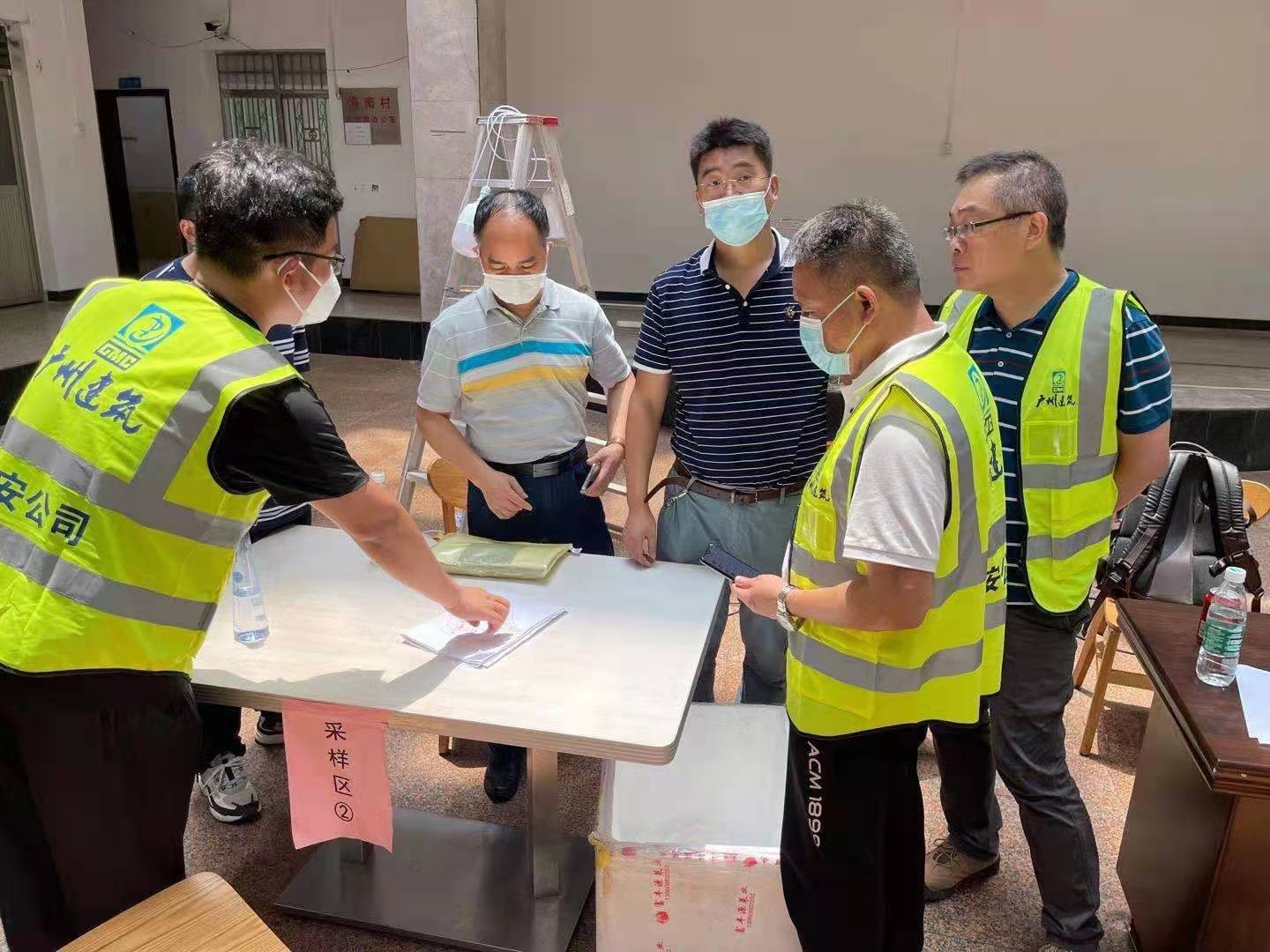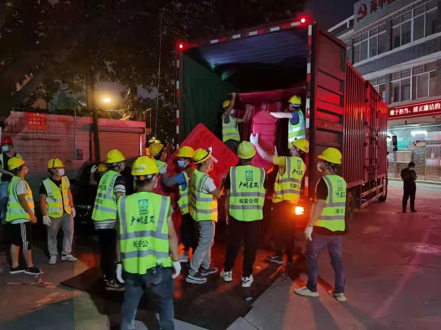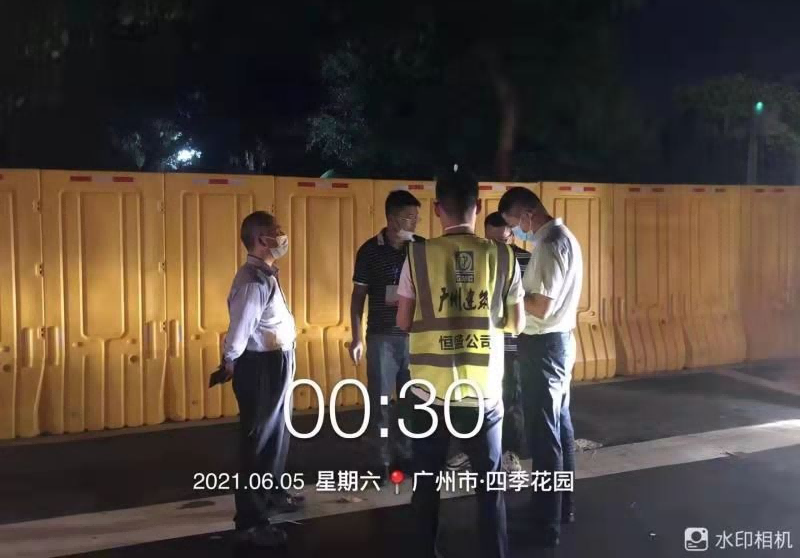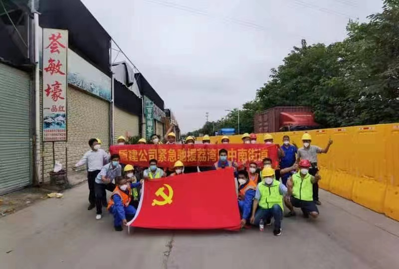 市设计院和产研院组织设计团队连夜统计围蔽工作量,彻夜不眠完成围蔽方案设计;市政集团共派出19名管理人员、58名工人参与石围塘街道围蔽施工,通宵完成围蔽1100米;总承包集团派出64人参与芳村街道围蔽施工,完成围蔽800米;工程事业部共派出30名管理人员和41名建筑工人参与花地街辖区内9个社区的围蔽施工,采取划片分区的施工模式,从早上7:30冒雨施工,持续作战十余小时。四建公司到晚上12时全部完成995米围蔽任务后28人转战冲口街,至今晨6时全部完成1000米围蔽任务。盾建公司通宵施工,负责荔湾区东沙街道东塱联社、中南街道花卉大街两个区域共计5100米的围蔽任务;第三批支援队伍16人晚上10点40分到达指定地点江南中街,后续20人正在向荔湾集结。