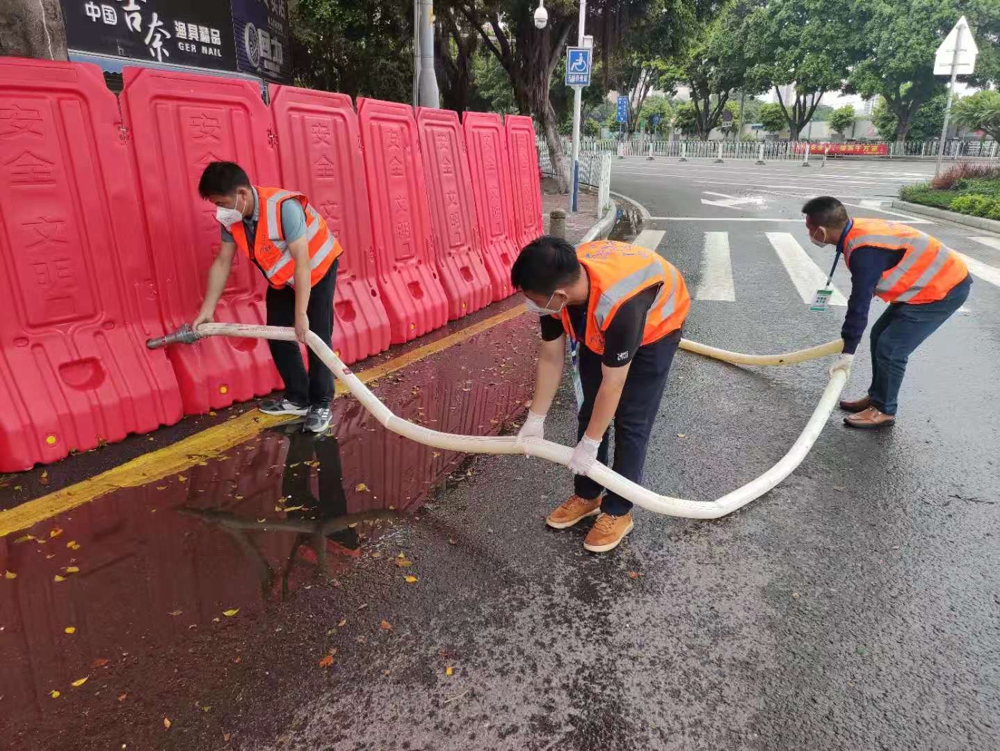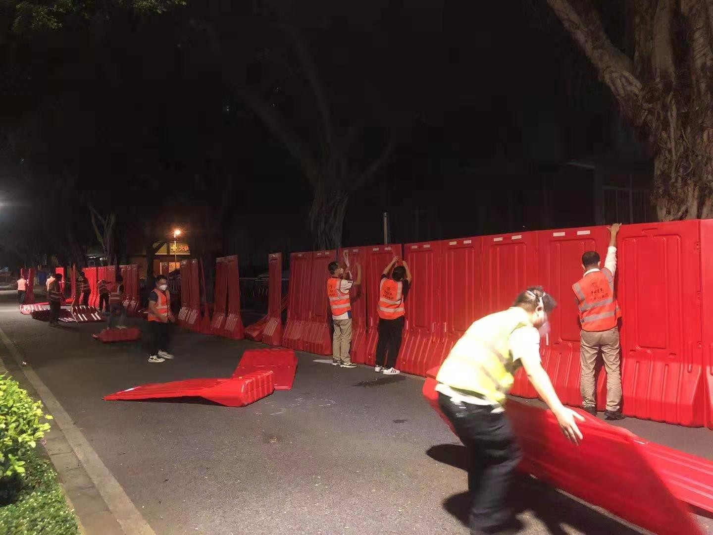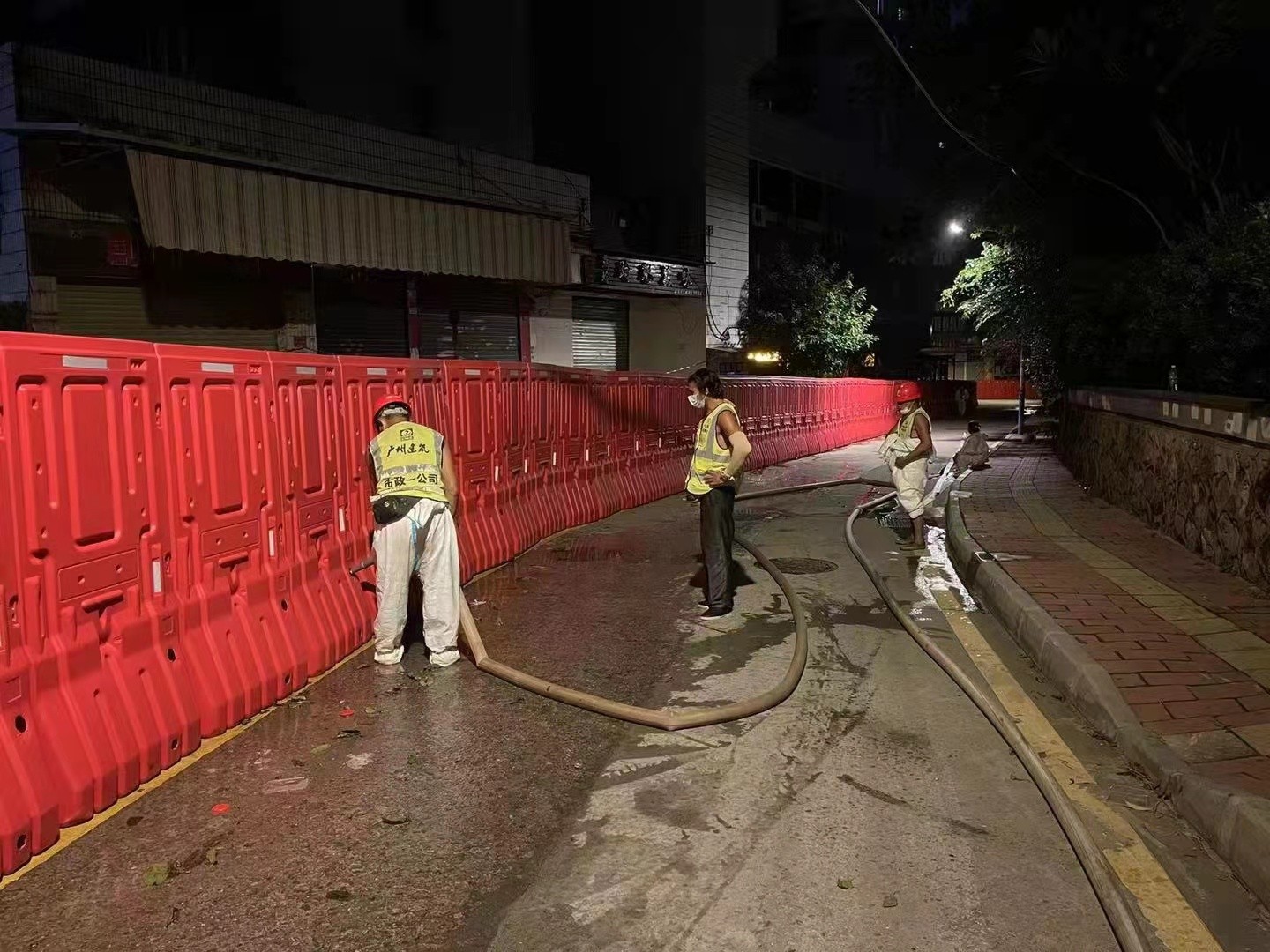 市设计院和产研院组织设计团队连夜统计围蔽工作量,彻夜不眠完成围蔽方案设计;市政集团共派出19名管理人员、58名工人参与石围塘街道围蔽施工,通宵完成围蔽1100米;总承包集团派出64人参与芳村街道围蔽施工,完成围蔽800米;工程事业部共派出30名管理人员和41名建筑工人参与花地街辖区内9个社区的围蔽施工,采取划片分区的施工模式,从早上7:30冒雨施工,持续作战十余小时。四建公司到晚上12时全部完成995米围蔽任务后28人转战冲口街,至今晨6时全部完成1000米围蔽任务。盾建公司通宵施工,负责荔湾区东沙街道东塱联社、中南街道花卉大街两个区域共计5100米的围蔽任务;第三批支援队伍16人晚上10点40分到达指定地点江南中街,后续20人正在向荔湾集结。