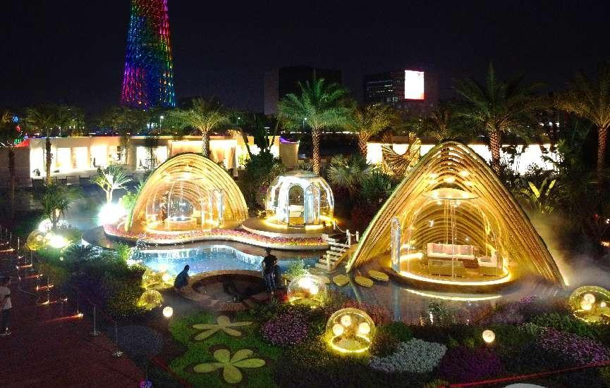 简介:作品以“天地人合一”为核心思想,通过使用镜面、镭射灯、声音互动装置等材料,融入水雾、花海、光与影等传统造景元素,组成独特的花园空间,映射出花都区独特且包容开放的城市生态。