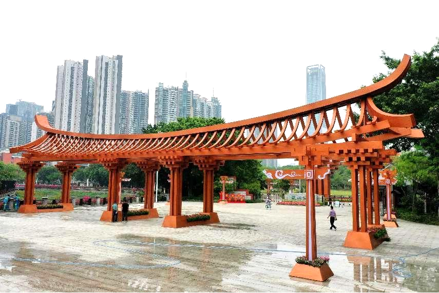 简介:作品结合猎德村深厚的物质及非物质文化遗产,以天河门表现出昔日猎德村龙舟庆典“碧波争渡”的场面;建造的开放之门,层叠渐增的方条斗拱,寓意广州天河正积极推进高质量发展,加快形成全面开放新格局。